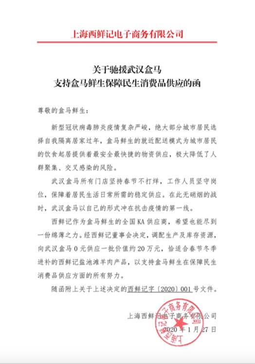龙商网&超市周刊消息:1月27日,上海西鲜记电子商务有限公司给盒马发来一份特殊的函件,上面写着“向武汉盒马0元供应一批价值约20万元的盐池滩羊肉产品,以支持盒马鲜生在保障民生消费品供应方面的所有努力。”