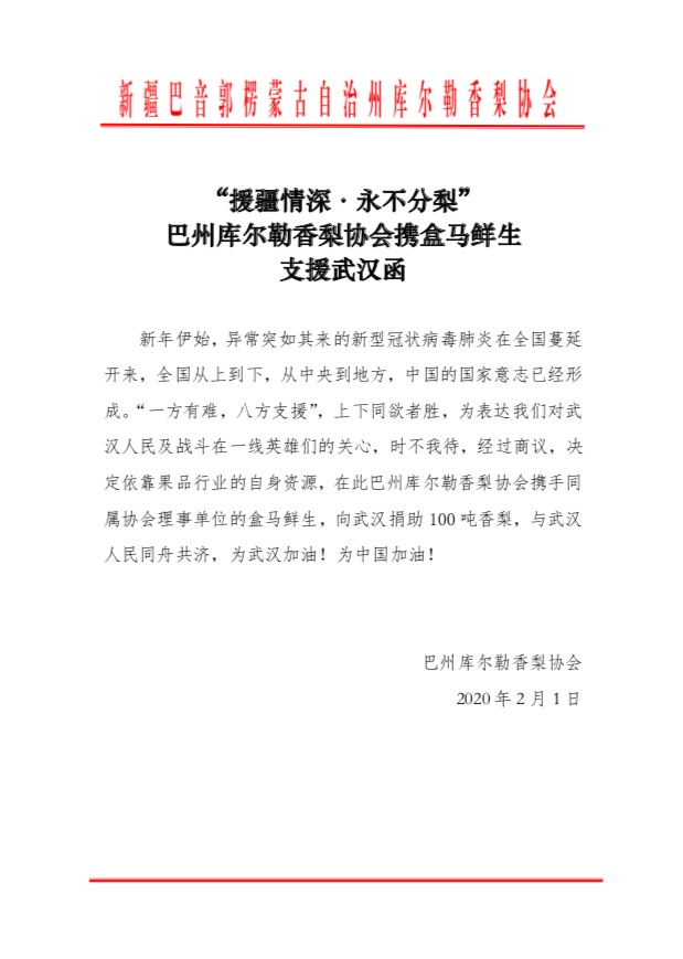 远在祖国大西北的新疆人民也伸出了援手。新疆库尔勒香梨协会的群里,大小商家纷纷出力,筹措了价值约158万的100吨香梨,希望通过巴州库尔勒香梨协会理事会成员盒马来对接给到武汉各大医院。但由于交通运输方面的原因,100吨香梨预估要在2月下旬才能顺利发货。