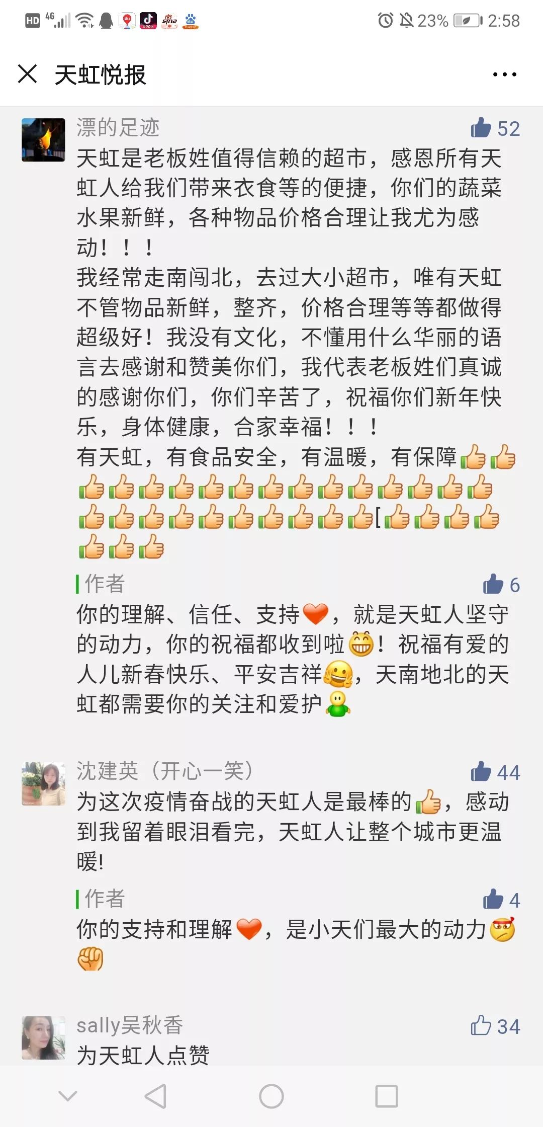 “ 我们作为供应商深受感动,在很多经销商要到2月中旬才接单供货的情况下,我们已积极与街道安监书面沟通后,确保2月1日开始给天虹供货,大家一起努力!我们心里都有一杆秤。向战斗在本次新冠肺炎疫情幕后的零售商英雄天虹商场致敬!”