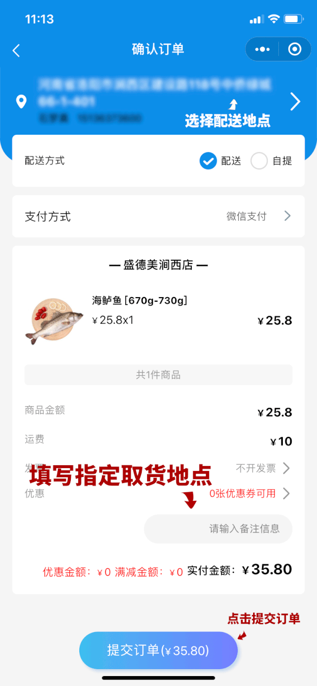 1. 需在线支付,您在下单后,需要您在 “确认订单” 界面下方的备注栏中填写您指定的收货地点。(xx小区门口、xx办公大楼门口)