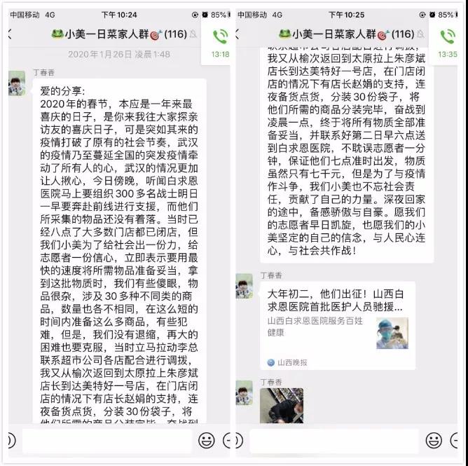 1月25日晚8点,当得知山西援鄂医疗队35名山西白求恩医院的医护人员出征物品还没着落时,小美团队连夜前往美特好一号店调货备货,在26日凌晨6点,及时送达白求恩医院,确保了医护战士们7点的准时出发。