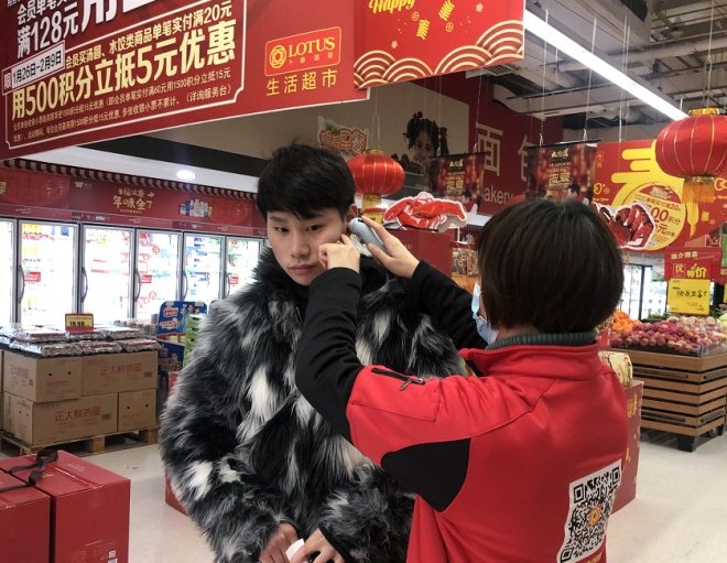在卜蜂莲花上南路店我们看到,门店员工罗洪粉戴着口罩,正在给顾客认真地测量着体温。同时,在超市储存柜等公共区域都贴上了“已消毒”提示。
