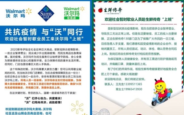 在盒马与多家餐饮企业达成暂歇性“员工共享”的合作后,沃尔玛2月5日宣布,在特殊时期,欢迎社会暂时歇业员工来沃尔玛“上班”。