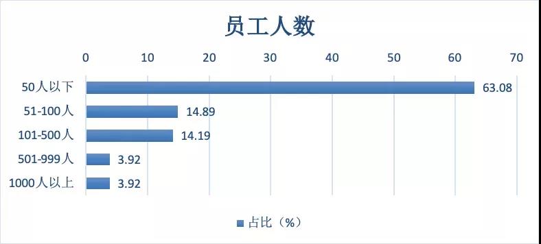 63.08%的企业员工人数不超过50人,50-100人、100-500人的企业分别占14.89%、14.19%,员工人数在500人以内的企业占92.16%,员工人数在500-999和超过1000人的企业均为3.92%。
