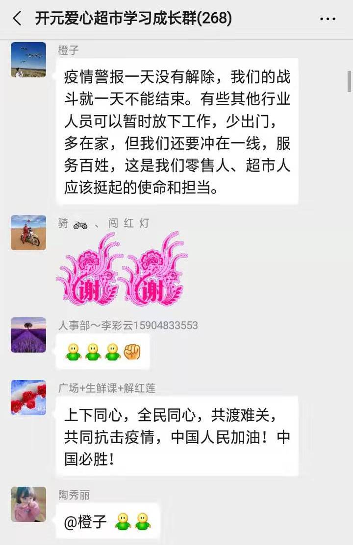 同时,开元爱心超市一线的“战士”也纷纷在微信群留下了自己的心声:
