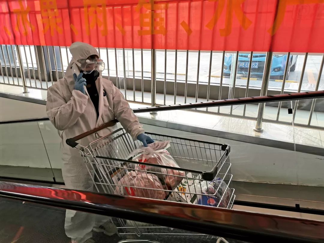 还有员工赵立超穿着防护服为顾客拣单、联系顾客、送货,因为里边有螃蟹,为了保证新鲜,拣完货赶紧开着自己的车,就送过去了。