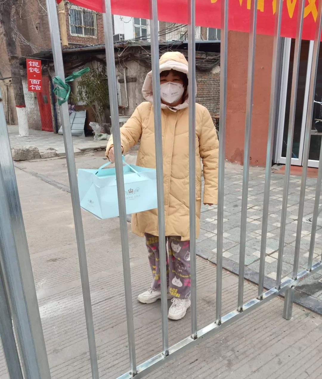 员工翟立伟,因为小区封闭门锁住,她只能爬到门上给顾客送货。