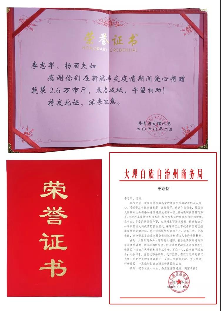 图内为共青团大理州委颁发给李志军、杨丽夫妇的荣誉证书