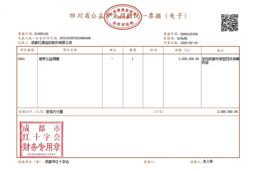 红旗连锁成都公司向成都市红十字会捐赠人民币300万元,定向用于成都市新型冠状病毒肺炎防疫。