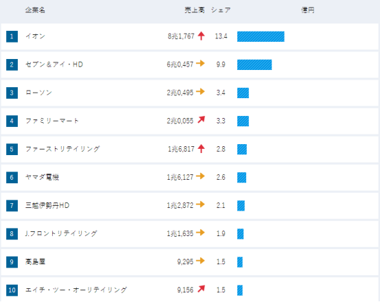 所谓市场占有率就是相对于零售行业的规模(对象企业合计333家)各个企业的销售额所占的比例。通过比较市场占有率能够了解到在零售市场各个企业所占份额。点击各个排名,就会跳转到各个零售公司的详细排名页面。箭头表示各企业的销售额与前一年比是增还是减。
