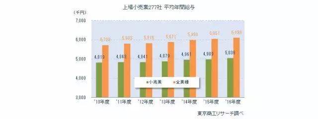 8月22日,日本东京工商研究局公布了2016年度零售行业277家上市公司的一年平均工资(以下简称平均工资),达到503.6万日元(中位数是485.6万日元),连续四年超过上一年度。
