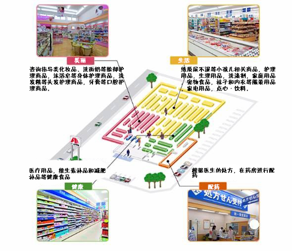 食物&药品店的一般模型是以低价格提供购买频率较高的食品(包含酒类)来吸引顾客,提升来访顾客数量,希望来到店面的客人一并购买主力商品的药妆。在店铺租金便宜的地方和郊外准备大面积的卖场,大量的准备以食品为主的生活必需品(耐久消费品基本不摆放),平时的购物基本可以在同一个地方解决,非常便利的店铺,他就是食物&药品店。