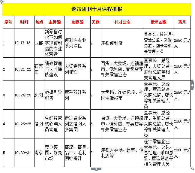 以下课程均可办理学习卡参加,想要加入超市周刊会员大家庭?请联系超市周刊各大区负责人: