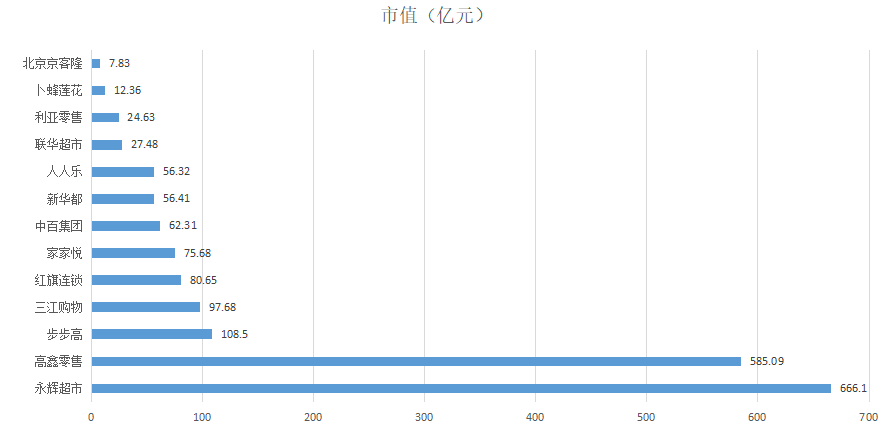 通过比较14家超市业态上市企业市值对比表,永辉超市和高鑫零售以绝对优势占据前两名。较于第三名的步步高,第二名的高鑫零售超出其市值476.59亿元。更为可怕的是,排在第一名的永辉超市比较于北京京客隆的7.83亿元,市值最大相差85倍。