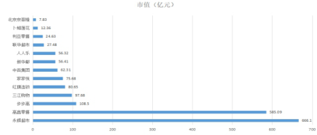 从上图可以看到永辉超市和高鑫零售遥遥领先、鹤立鸡群。此后的数家企业以倒金字塔结构形成巨大反差,市值差别不是一般悬殊。