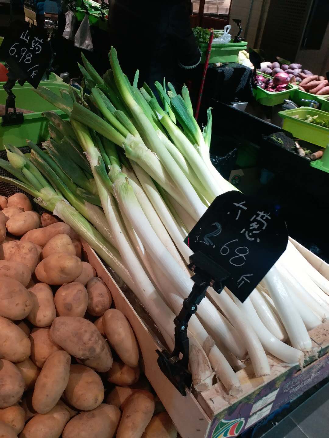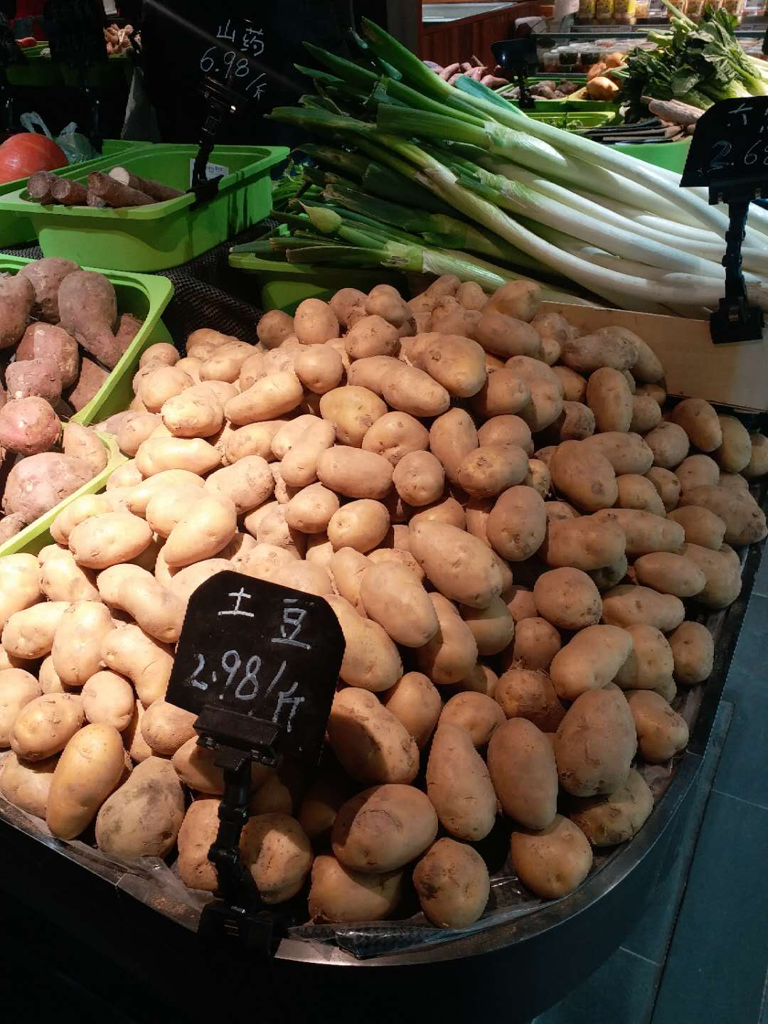 2、入口中央水果蔬菜两大环岛,均分为散称,常温、冷藏精包装两类,价格小贵,比如土豆,品质中等,2.88元/斤。