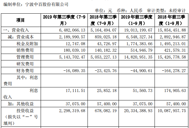报告显示,2019年7至9月,宁波中百营业收入为6482066.13元,比上年同期增长25.51%;营业利润为1323819.33元,比上年同期增长1161%;净利润为1316608.77元,比上年同期增长1058%。