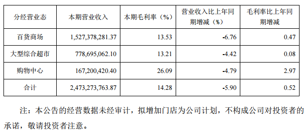 按经营业态分,百货商场第三季度营收为1527378281.37元,比上年同期减少6.76%,毛利率为13.53%,比上年同期增长0.47%;大型综合超市营收为778695062.10元,比上年同期减少4.42%,毛利率为13.21%,比上年同期增长0.08%;购物中心为167200420.40元,比上年同期减少4.79%,毛利率为26.09%,比上年同期增长2.97%。