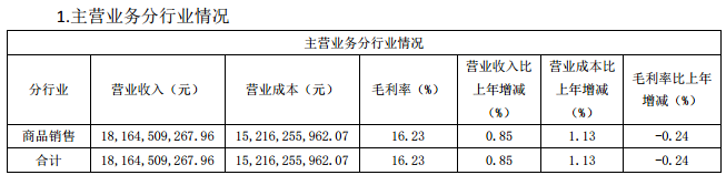 公告显示,第三季度王府井营业收入为18164509267.96元,比上年同期增长0.85%;营业成本为15216255962.07元,比上年同期增长1.13%;毛利率为16.23%,比上年同期减少0.24%。