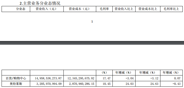 按经营业态来分,百货/购物中心营业收入为14958538273.87元,比上年同期减少3.04%,毛利率为17.47%,比上年同期增长0.07%;奥特莱斯营收为3205970994.09元,比上年同期增长24.03%,毛利率为10.45%,比上年同期减少0.43%。