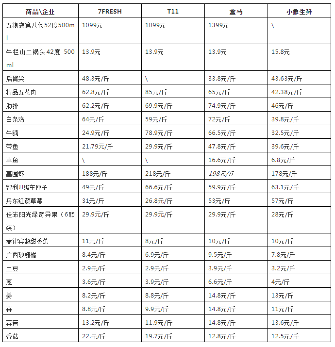 节前,龙商网&超市周刊记者分别走进位于北京的7FRESH、T11生鲜超市、盒马鲜生、小象生鲜四家门店,并就一些普遍的年货进行了价格调查。