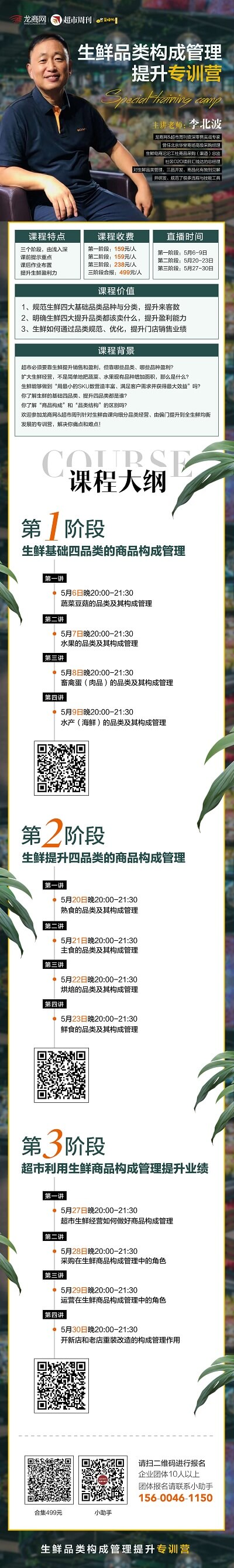 向生鲜全品类经营能力提升进发!龙商网&超市周刊零售实战专家李北波老师将分别在5月6-9日、20-23日、27-30日分三个阶段进行《生鲜品类构成管理提升专训营》: