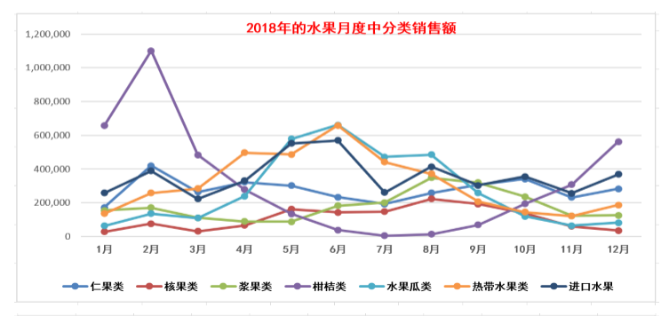 ▲ 2018年某超市水果月度中分类销售规律