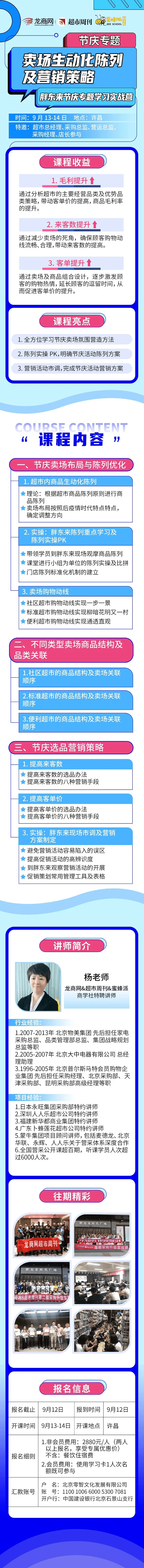 9月13-14日(12日报到),龙商网&超市周刊&蜜蜂派商学社特别推出的“卖场生动化陈列及营销策略实战”节庆专题培训班将在河南许昌开课。