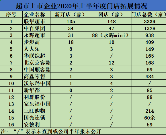据龙商网&超市周刊不完全统计,截至9月14日,已有16家超市上市企业公布了2020年半年报,记者注意到上半年各企业闭店总数为324家(以年报内已披露数据为准),累计开店数235家,闭店数比开店数要多89家。