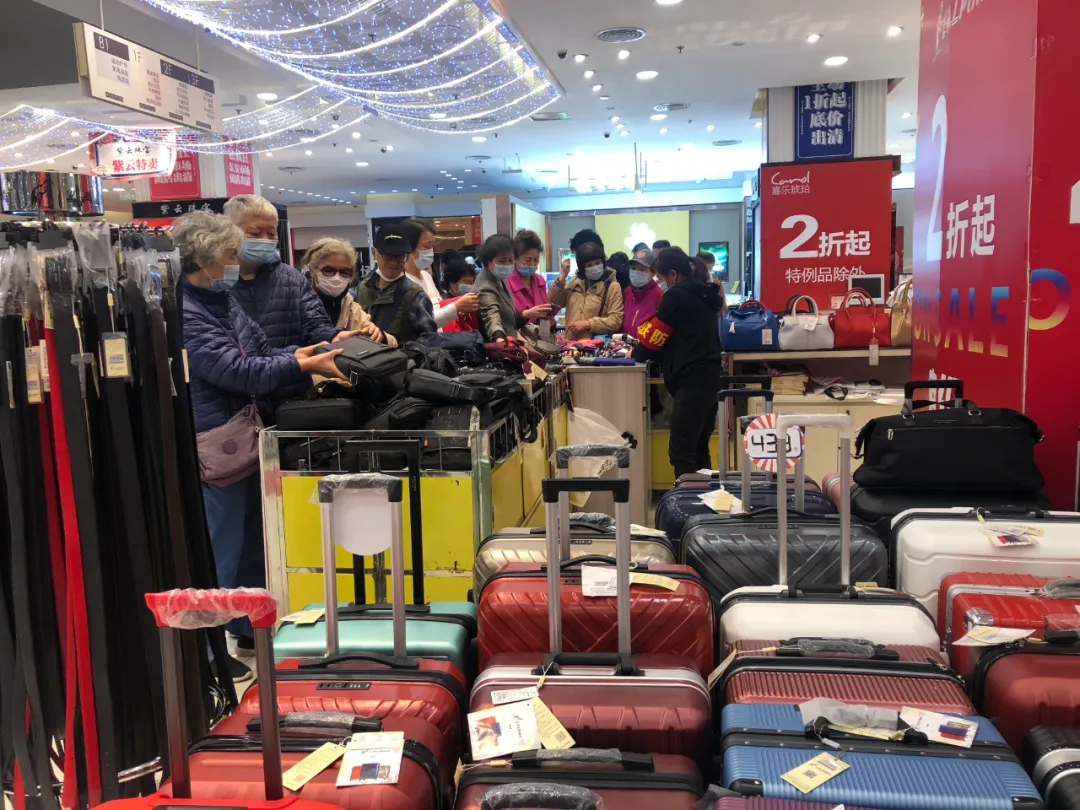 印有“打折、清仓”的促销海报在卖场内随处可见,海报上“1折、2折、99元起”等大字时刻提醒着消费者“实惠、划算”,与卖场内抢购热闹的氛围交相辉映,给王府井大街增添了几分不同往常的热度。