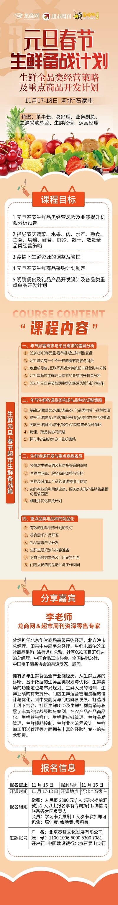 11月17-18日(16日报到),龙商网&超市周刊将在河北石家庄举办“元旦春节生鲜备战计划--生鲜全品类经营策略与重点商品开发计划”专题培训课。