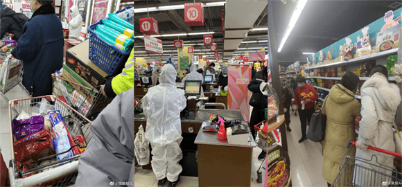 龙商网&超市周刊记者从石家庄下辖的无极县两家商超企业相关负责人处了解到,从1月4日开始,大批附近村庄的消费者涌入到超市里抢购米面粮油和蔬菜等基本生活必需品,排队如长龙,阵仗就像春节前最后几天人们采购年货时一样,购物车满满的都是商品。
