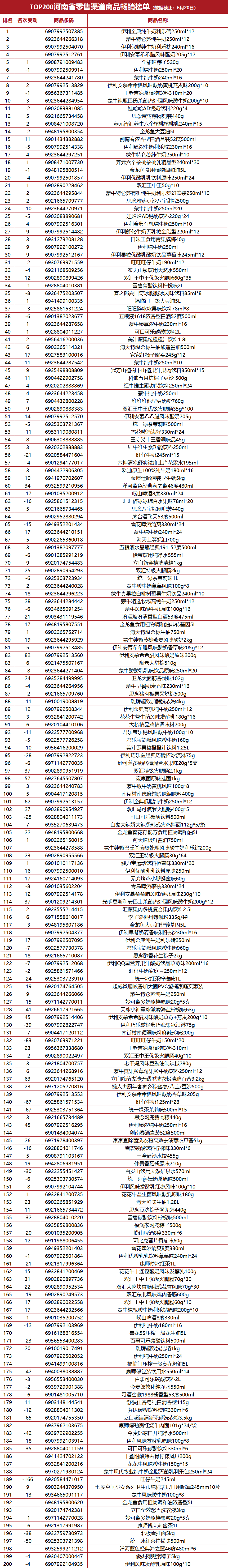 “TOP200河南省零售渠道商品畅销榜单”发布(6月13日版)