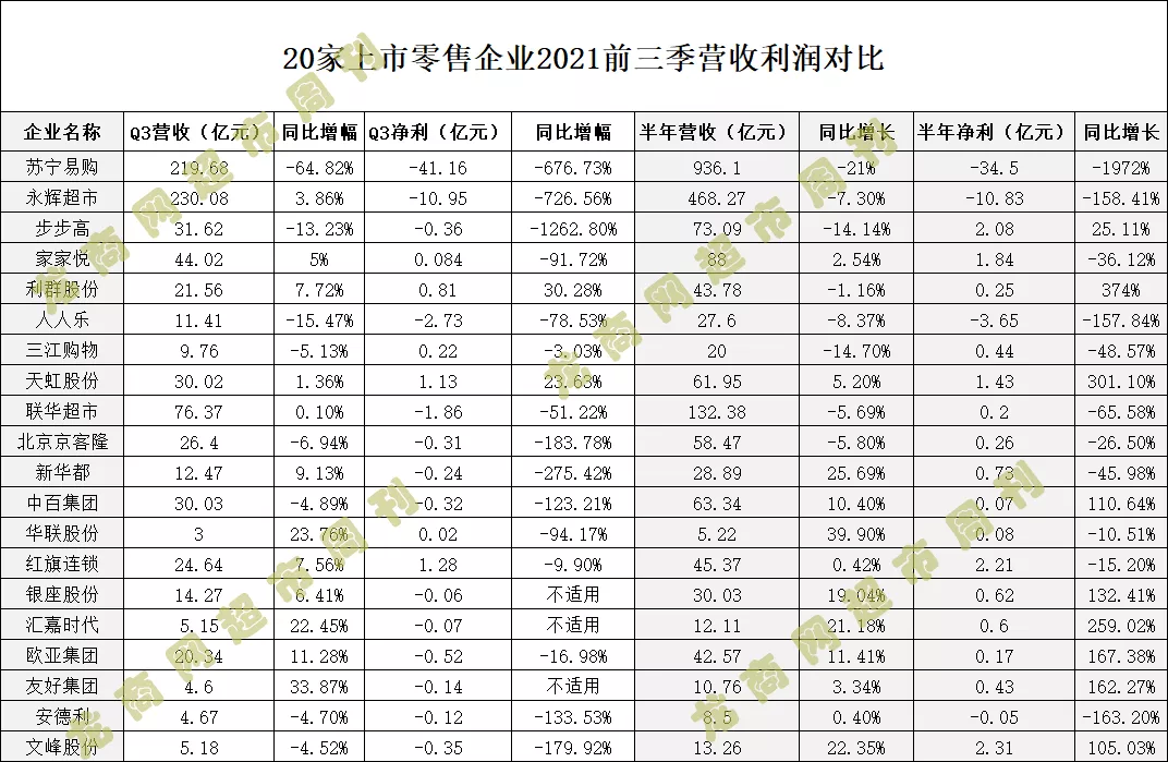 日前,零售业上市公司三季报陆续出炉。通过对20家上市零售企业的业绩统计梳理,再对比其上半年业绩表现,呈现出以下特点。