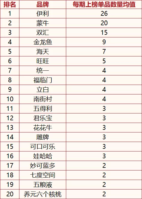 TOP20品牌平均每期上榜124.2品,占榜单62.1%。