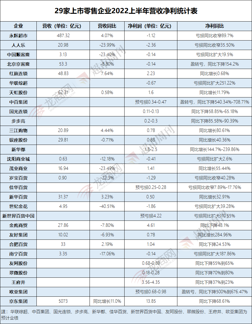 回顾上半年,新冠疫情反复、消费环境低迷,增加了企业发展的不确定性。这种情况下,零售业内部的变革也在加快,企业转型升级、提质增效加速,各施所能穿越周期。根据对28家(京东除外)已公布业绩或预计业绩的上市企业统计,约半数亏损。