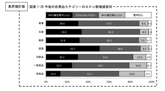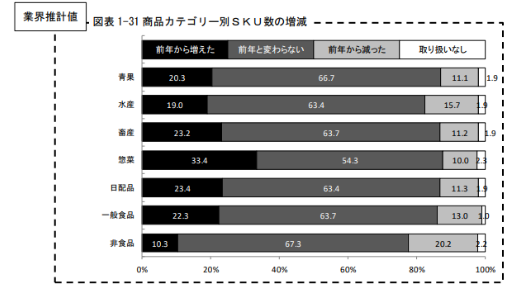 因此,大多数超市仍在不遗余力地增加预制餐品种,从与上年相比各商品类别的SKU数“从上年开始增加”的比例来看,整体上预制餐最高,为33.4%,其次是日配品、畜产。相反,关于“从上年开始减少”的比例,非食品最高,为20.2%,其次是水产。