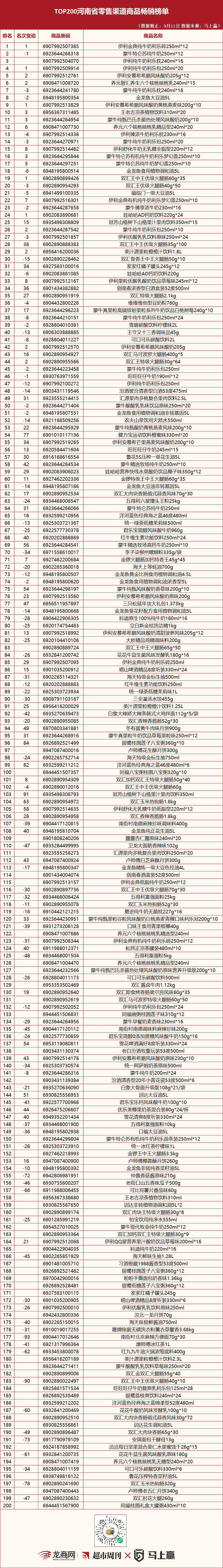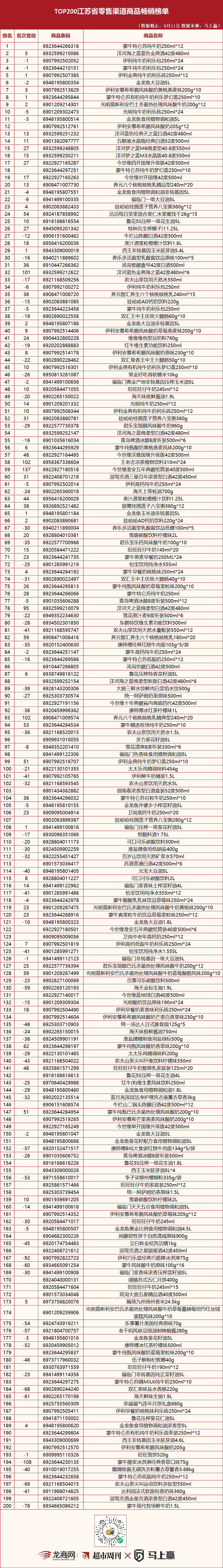 1.本期江苏更新38品,更新19%;河南更新39品,更新19.5%。两地榜单中的相同单品共62品,占比31%,同为两地TOP10的4品:蒙牛特仑苏纯牛奶250ml*12、伊利金典纯牛奶利乐砖250ml*12、金龙鱼大豆油5L、伊利安慕希希腊风味酸奶黄桃燕麦味200g*10。
