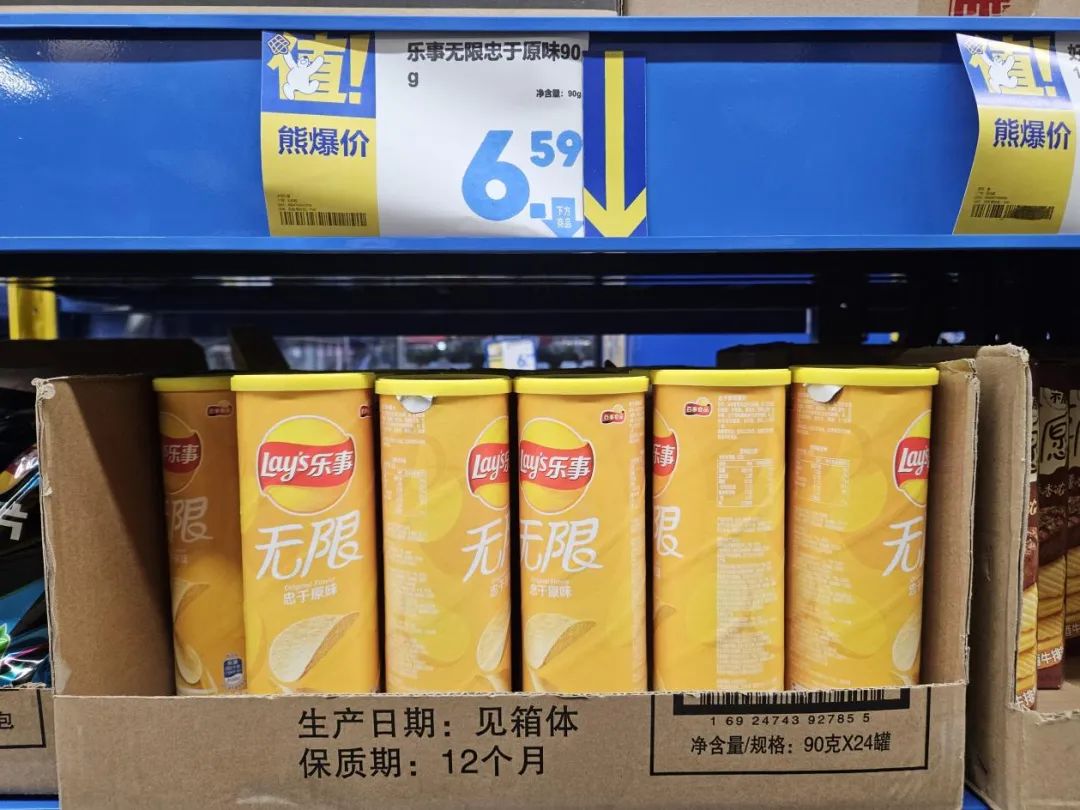 90克的乐事原味薯片6.59元/筒、500毫升可口可乐零度汽水2.29元/瓶、500毫升的雪花勇闯天涯3.79元/听、250毫升×12盒我得纯牛奶15.99元/箱……