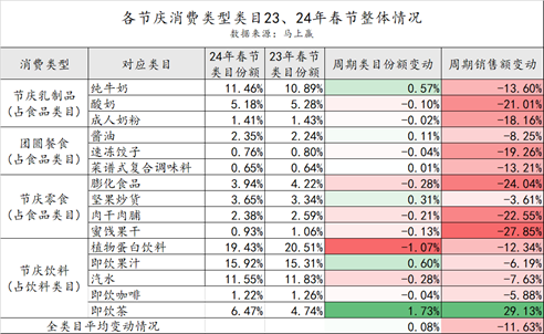 该报告统计数据显示,春节期间包括乳制品、团圆餐食、干果零食、节庆饮料等各类目在内的销售额平均下跌超10%,但是个别类目出现增长(如下图)。