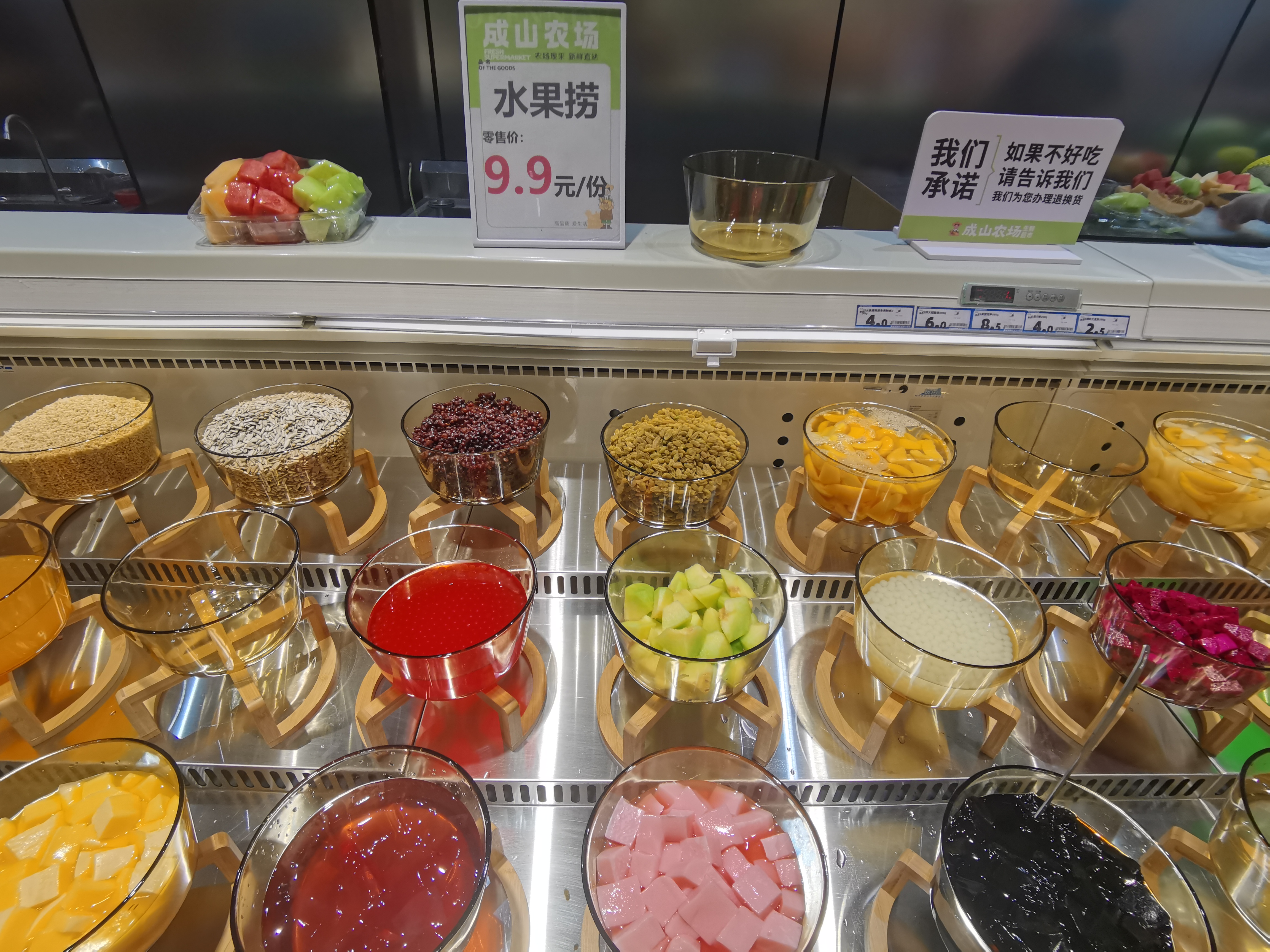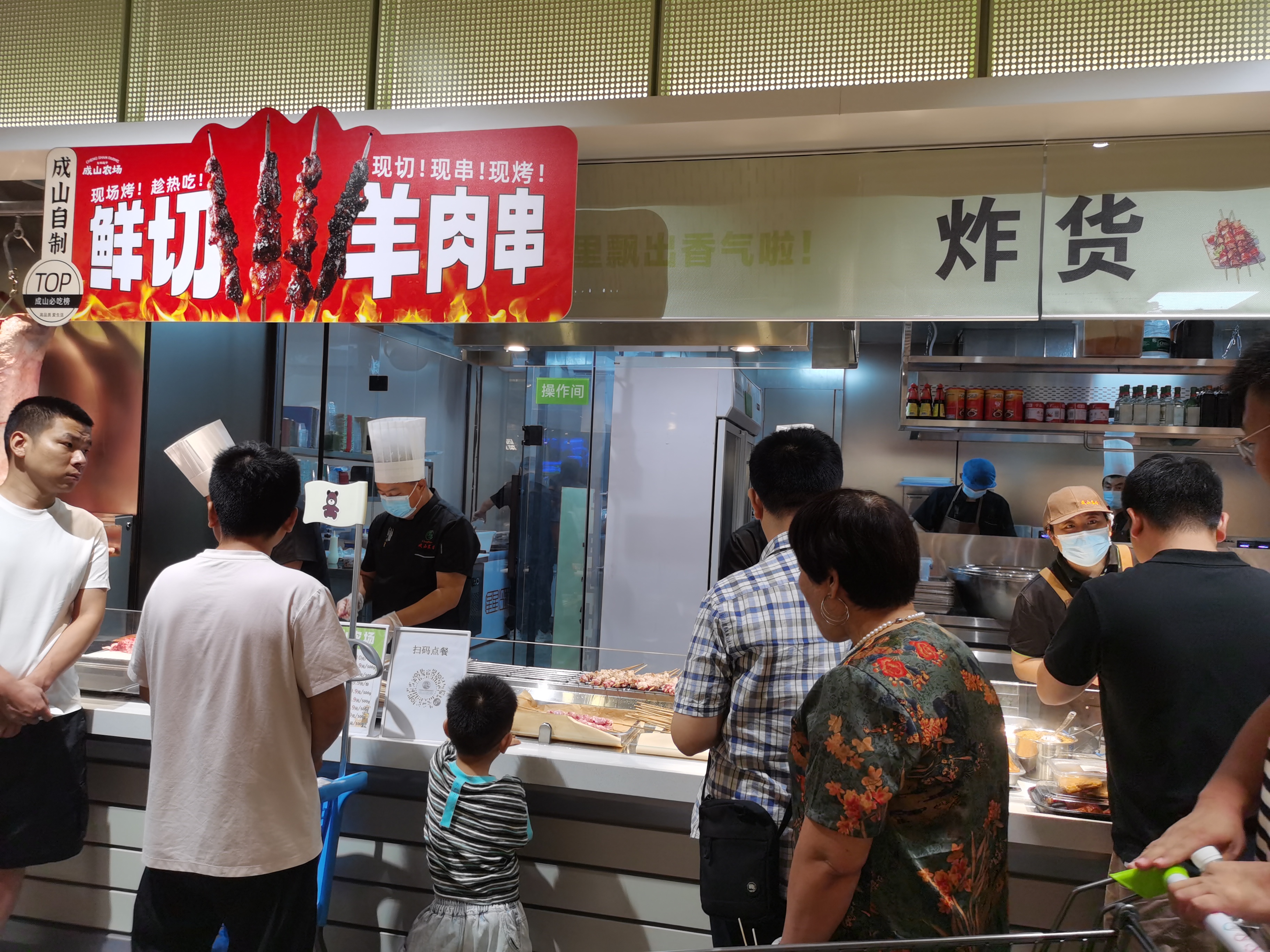 该店一以贯之,主打生鲜,其经营面积能达到60%,其中加工占到一半左右。再进一步,加工品类里尤以趋势性品类如各地特色小吃、披萨、烧烤、肉夹馍、酸奶水果捞、果切、寿司等为主,占比能达到该细分品类的60%、自营比例达到95%,以满足与购物中心更适配的年轻客群的需求。